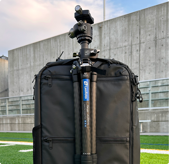 Reinforced tripod straps. Premium materials built for rain, dirt, airports, chaos.