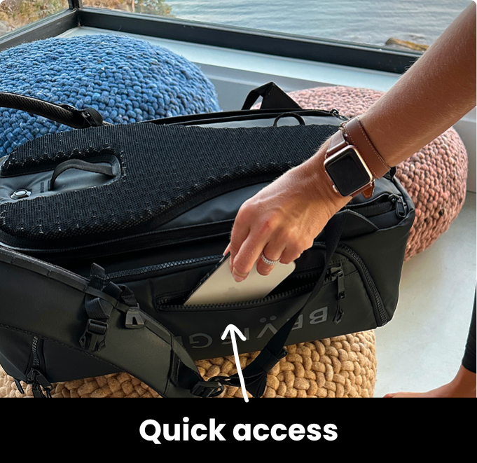Our ultra-padded straps and ergonomic build keep weight balanced and pressure off your shoulders. Bungee suspension straps hold your shoulder straps upright so it feels like someone’s helping you put the bag on and out of the way when you open the lid of the bag.